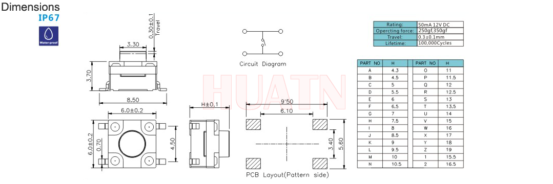 轻触开关 180° SMT 6.0x6.0mm 防尘防水IP67